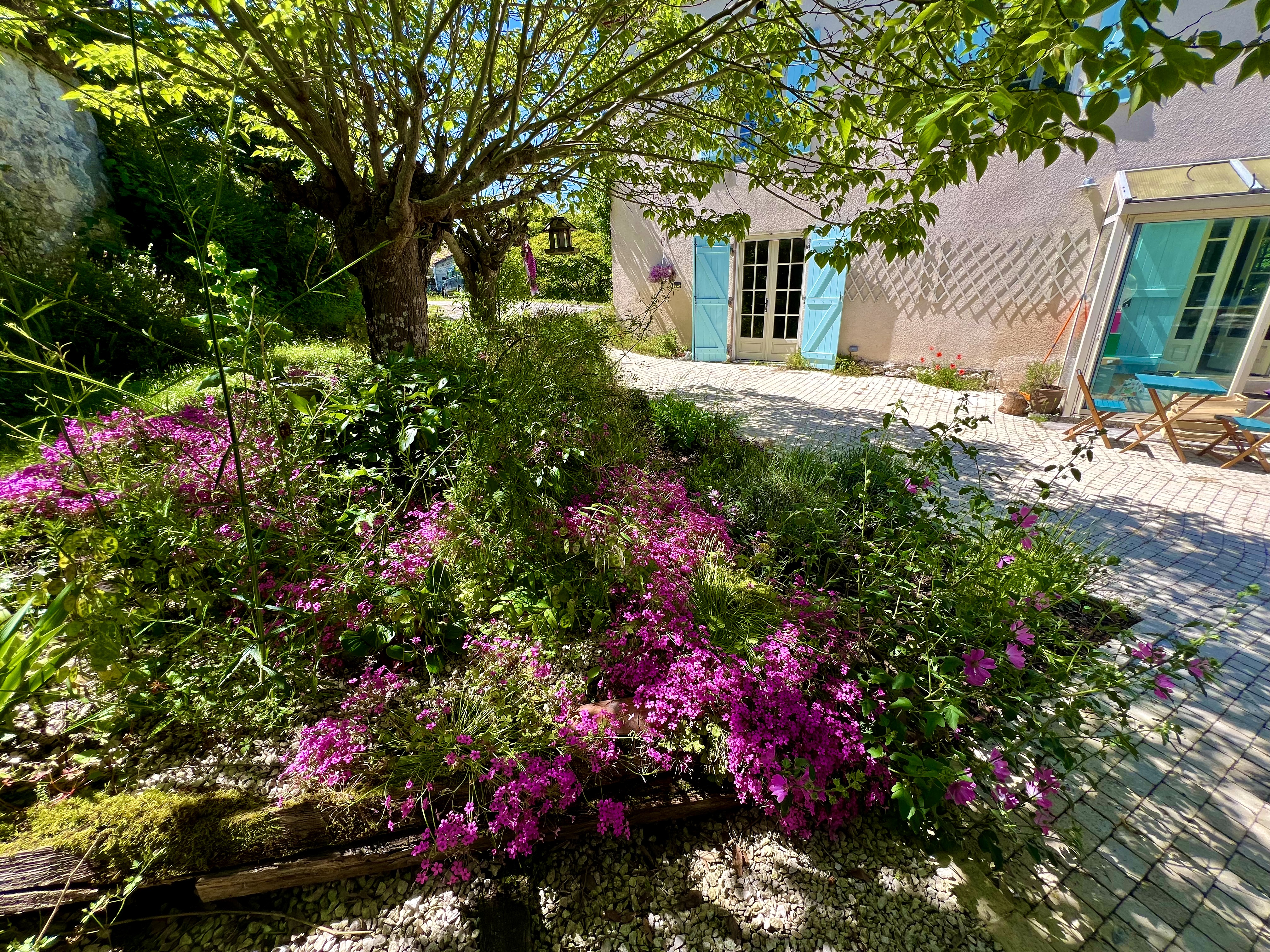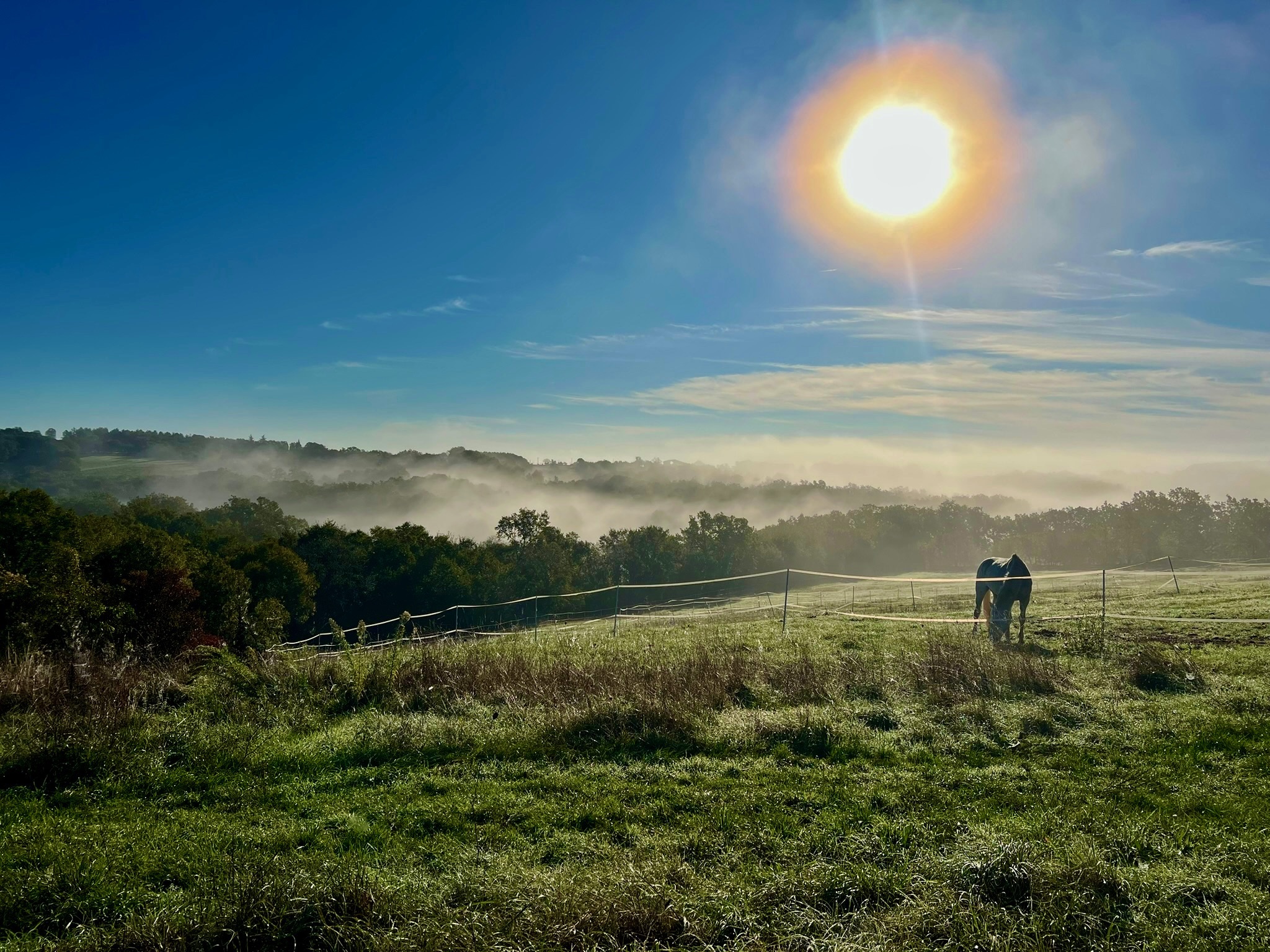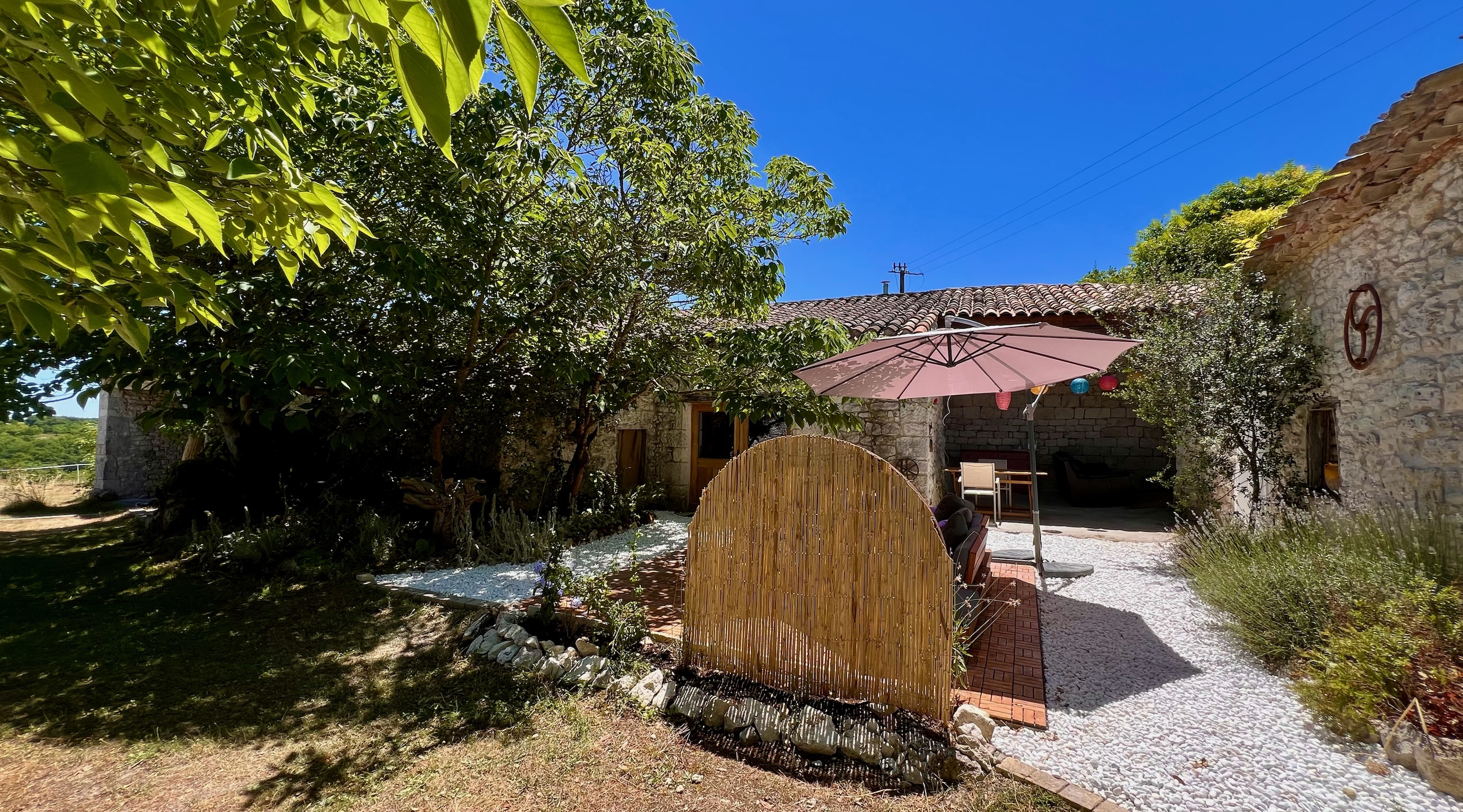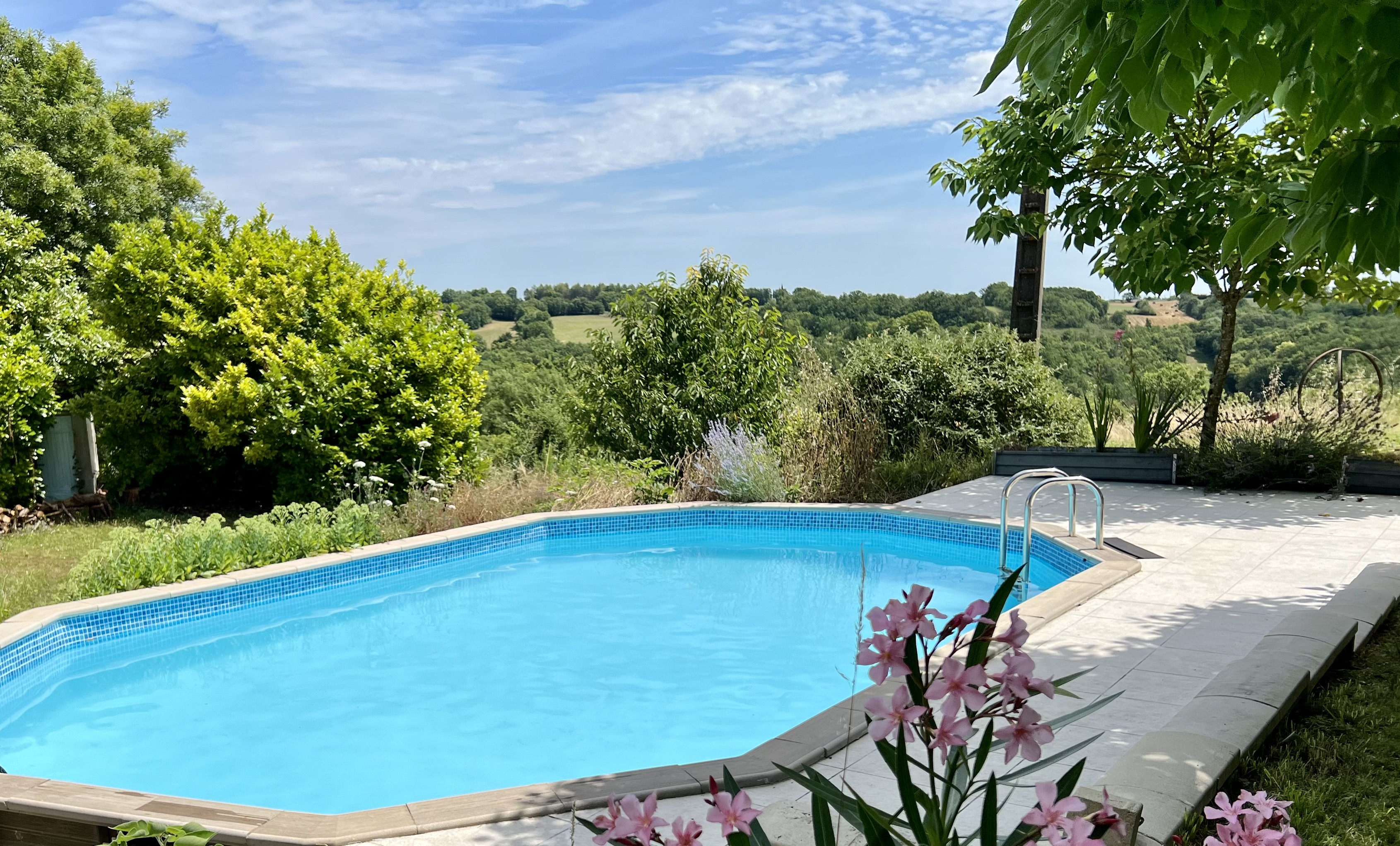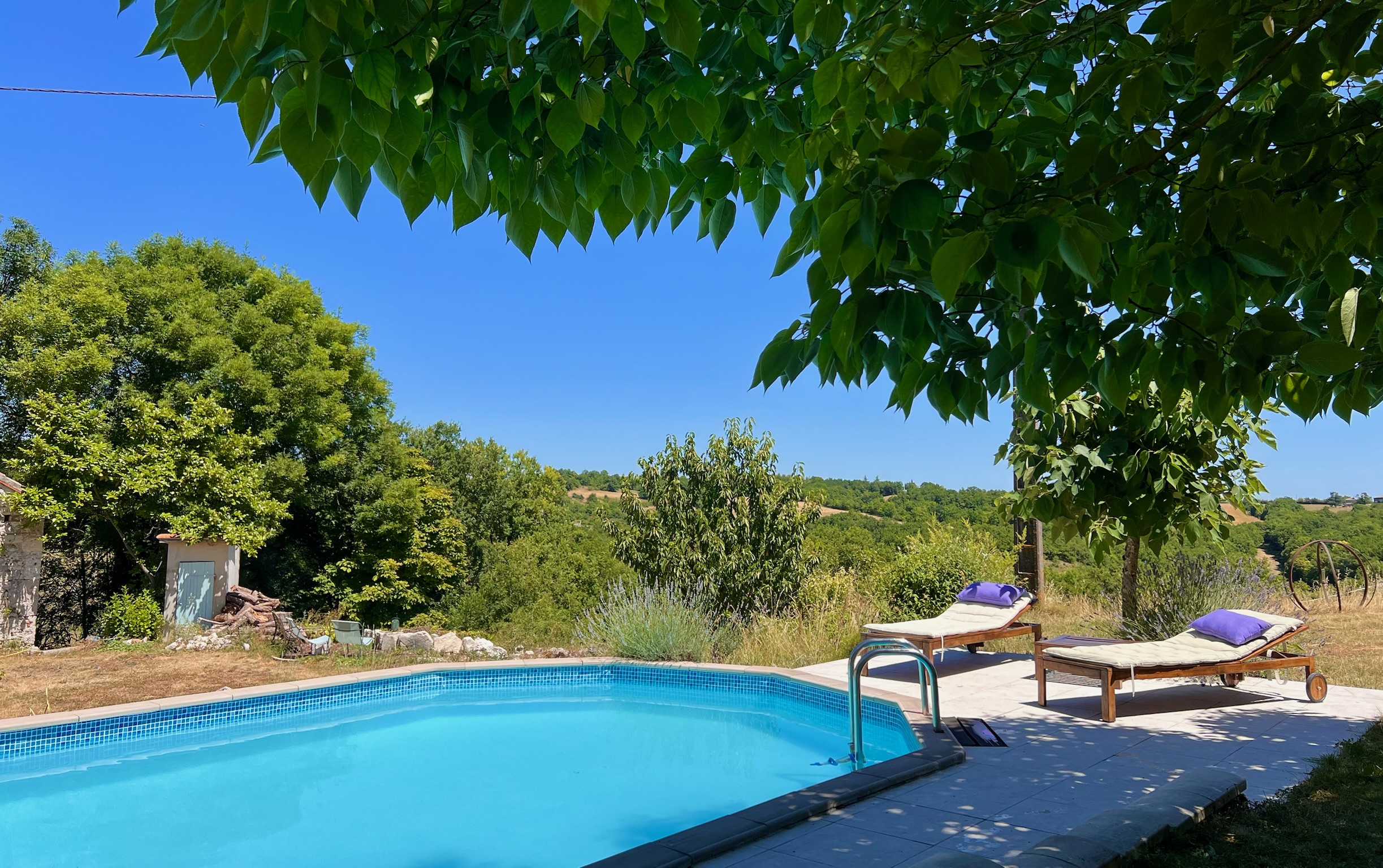 The Gîte is located on a dead-end road, within an old farmhouse arranged around a kind of inner courtyard that opens onto our meadow, with a 180º view of the surrounding countryside. It is attached to Lilith's house, and on the other side of the courtyard is the main house of Eva and Julien, along with the large barn. The Gîte opens onto a private terrace with a sofa, parasols, table, chairs, and a BBQ. The swimming pool is right in front of the terrace and offers a stunning view over the valley below, with its white oaks and the 2.5-hectare meadow.