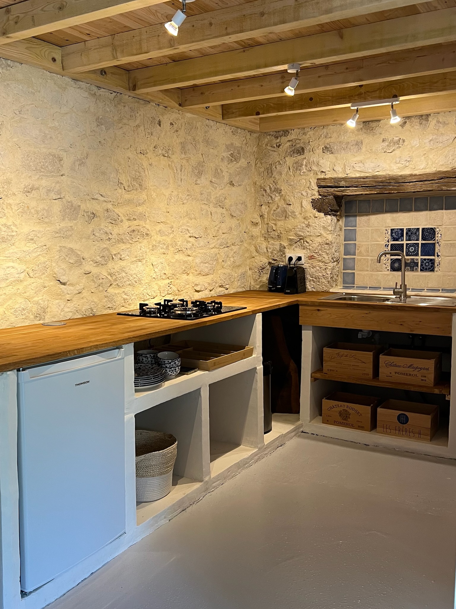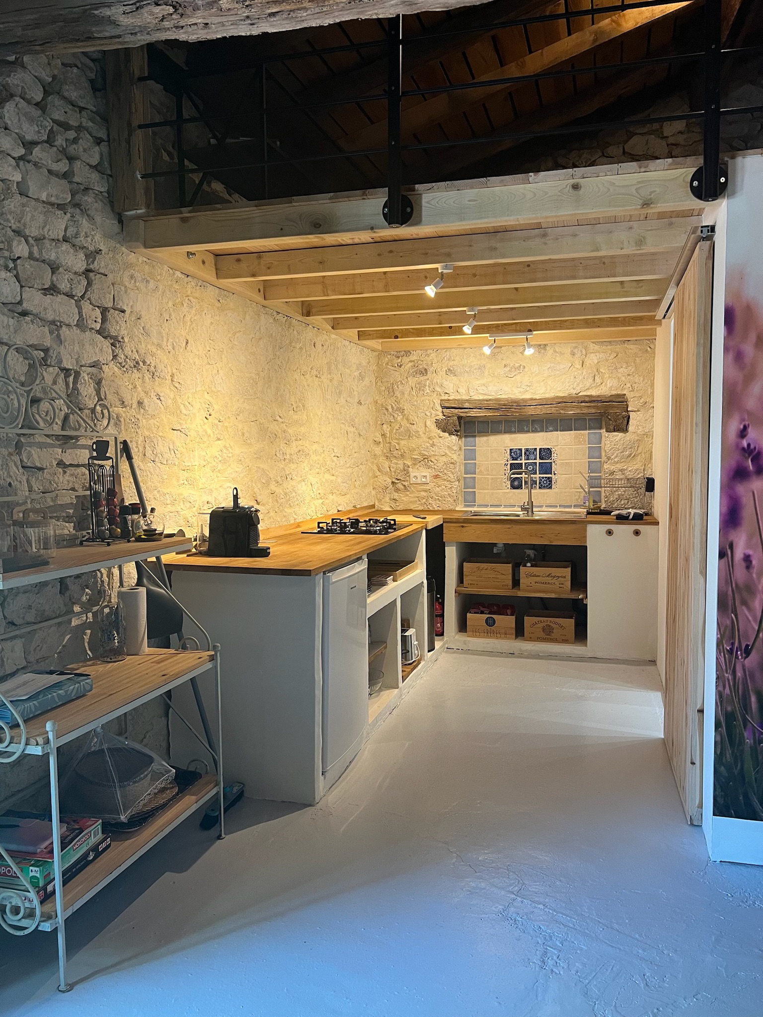 The Gîte is fully equipped with a bathroom, kitchen, and living room, and is ideally suited for 2 people (King-size double bed). The bedroom is located on a mezzanine above the bathroom and kitchen, and is accessible via a staircase. Outside, a table, chairs, and a small barbecue allow you to enjoy the good weather. The terrace features a large sofa, and the pool is right next to it with sun loungers and parasols.